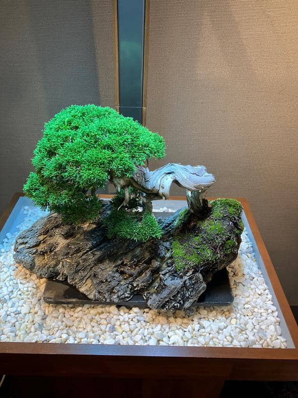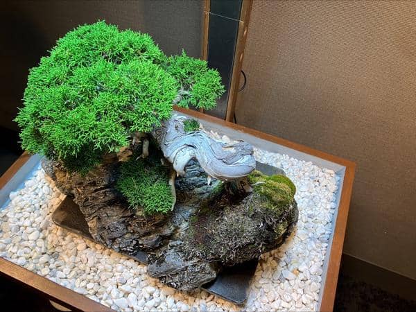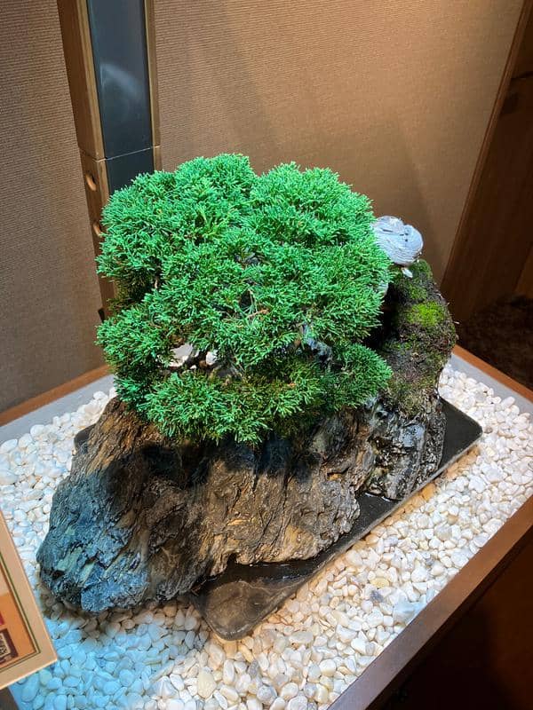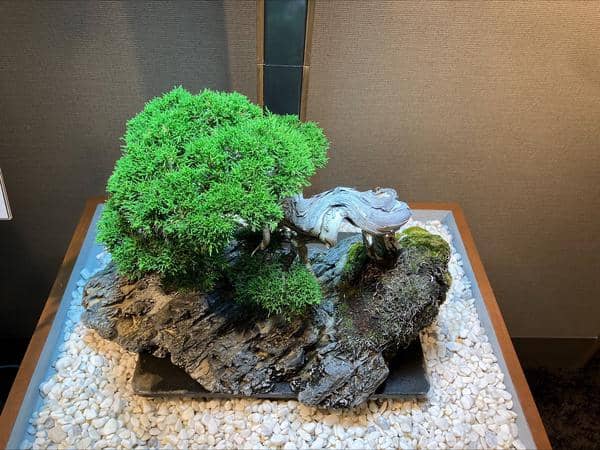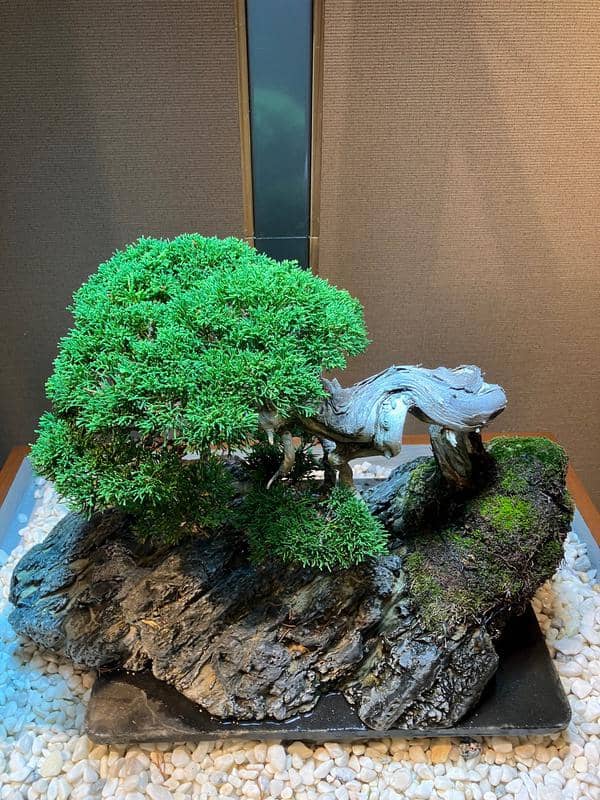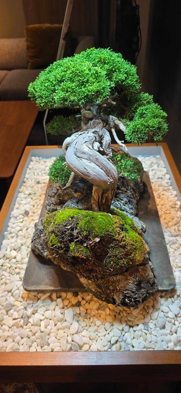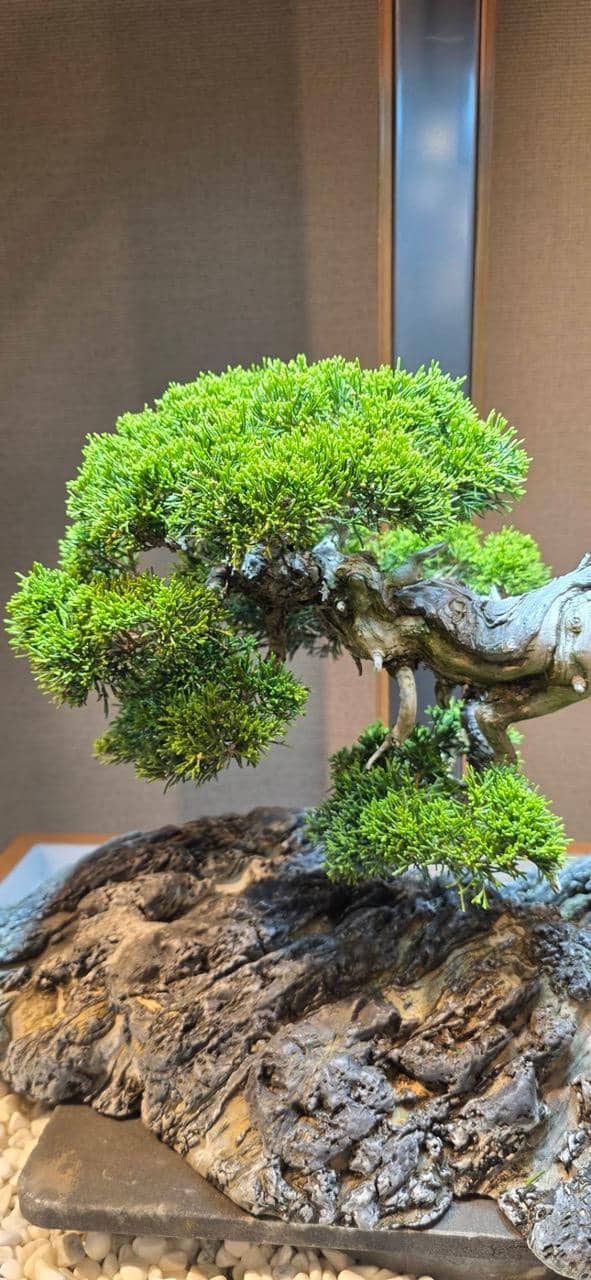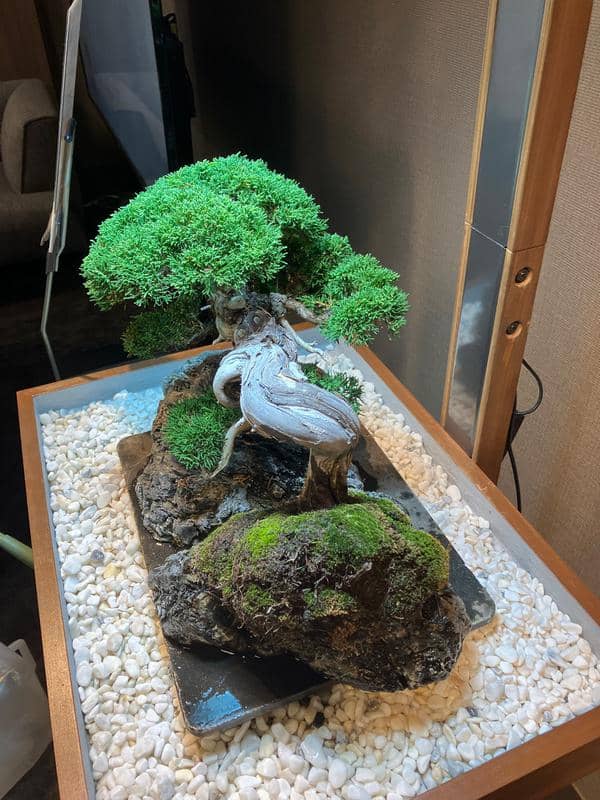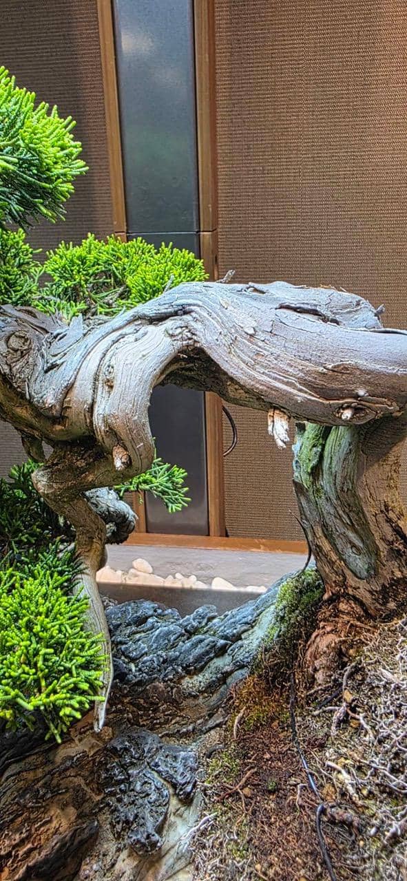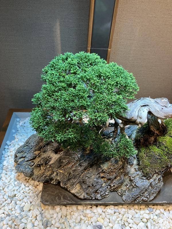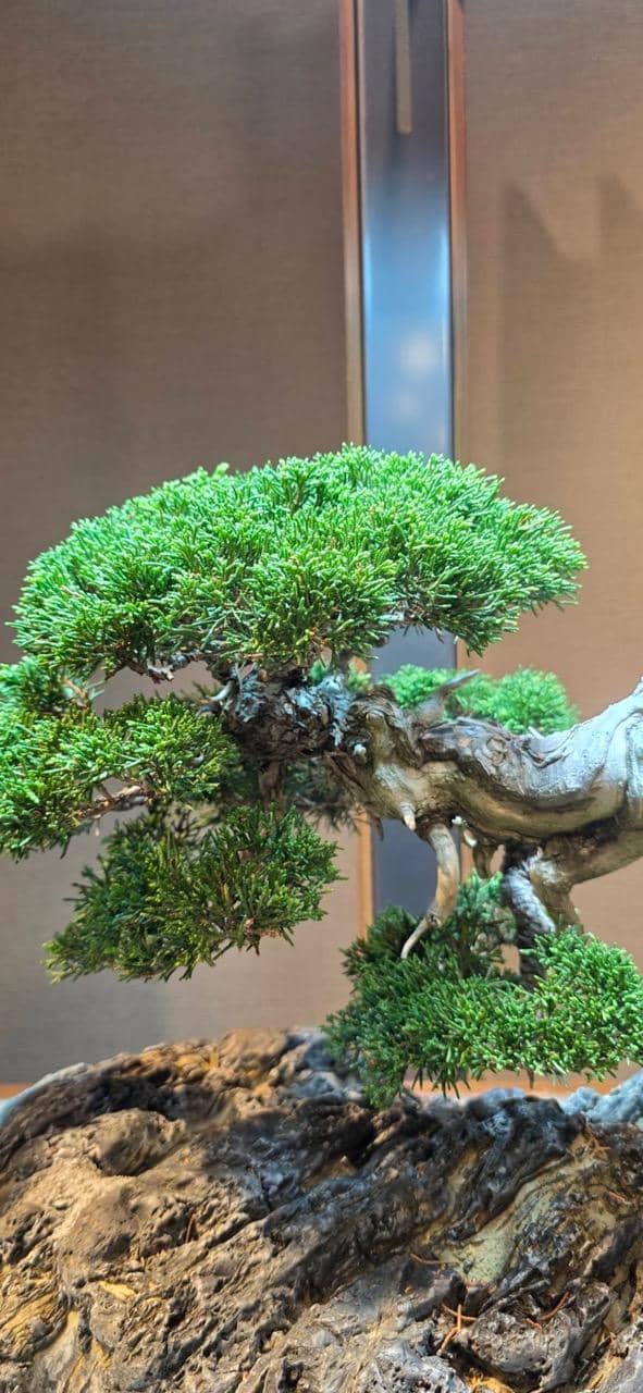 サロンに展示してもうすぐ6ヶ月、自然光がゼロの室内で樹齢70年の真柏は真に美しい状態を保ちながら成長しています。