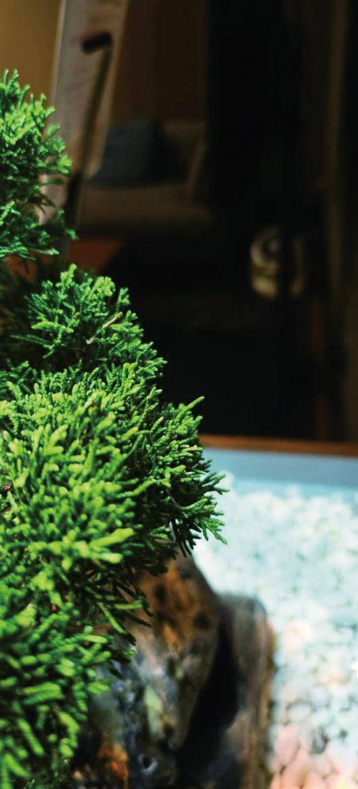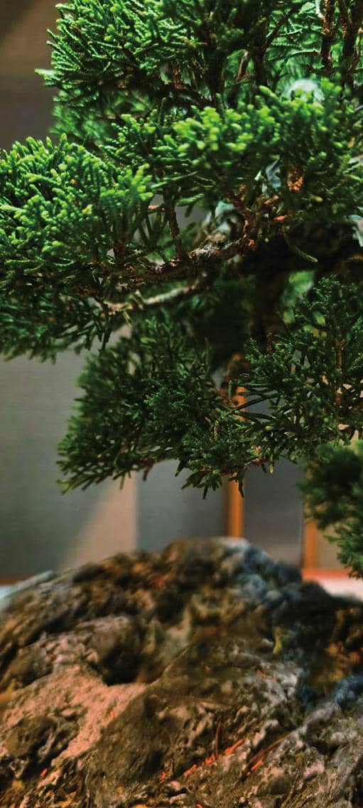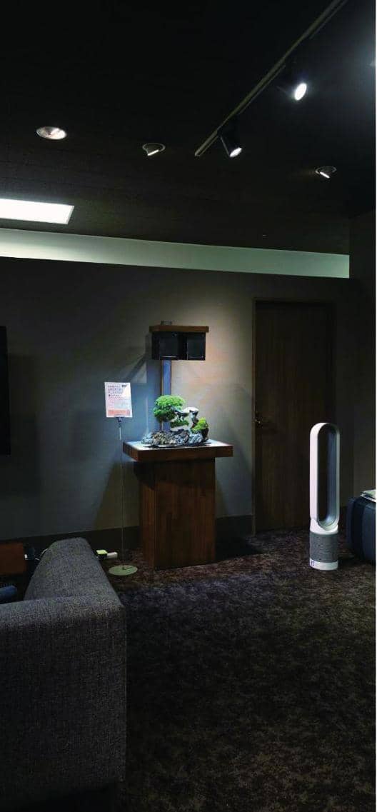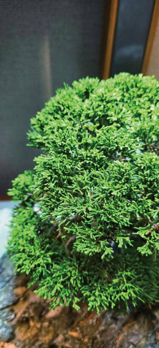 展示した真柏は、ただの1度も陽に当たることなく葉色は外より濃く、 艶やか、徒長することも無く苔も生して真に美しい景色になっています